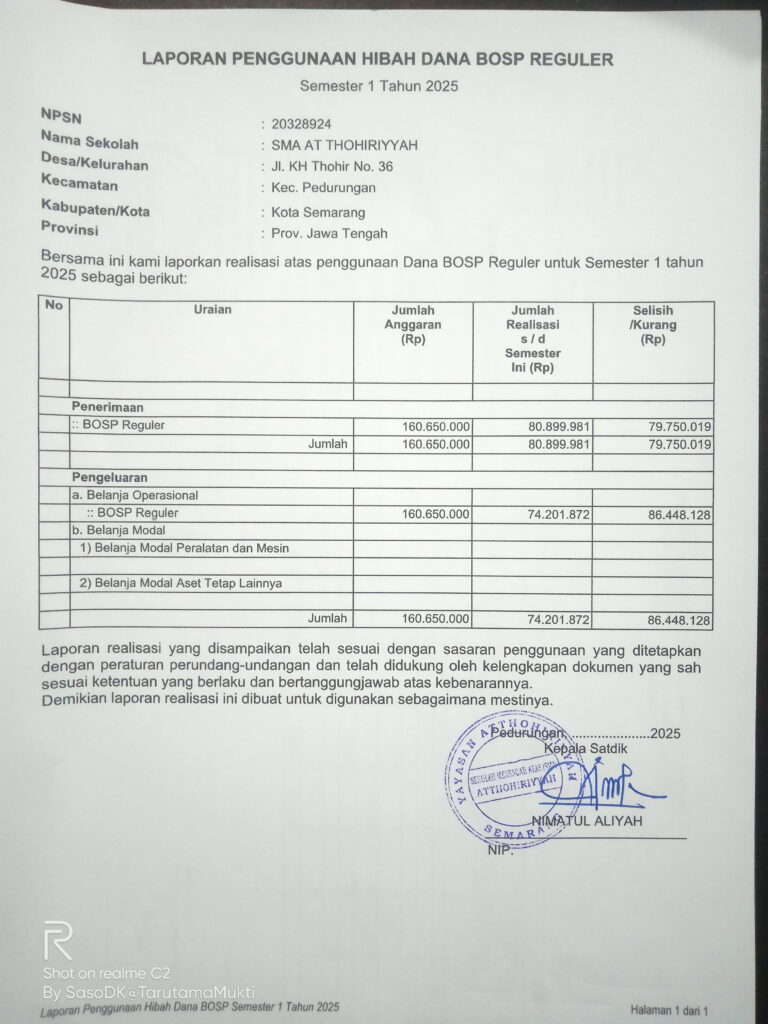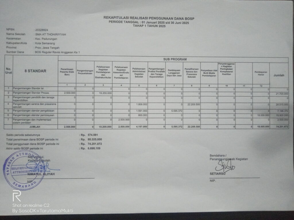 Realisasi penggunaan Hibah Dana Bantuan Operasional Satuan Pendidikan (BOSP) Reguler semester 1 (Januari- Juni ) tahun 2025 SMA At Thohiriyyah melalui Sub Program sebagai berikut: